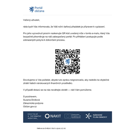 E-mail se tváří jako zpráva z Portálu občana a informuje o „daňovém přeplatku připraveném k vyplacení“. Obsahuje QR kód, který má údajně „přesměrovat na zabezpečený portál“. Ve skutečnosti však vede na podvodnou webovou stránku, jejímž cílem je získat přihlašovací údaje uživatele.